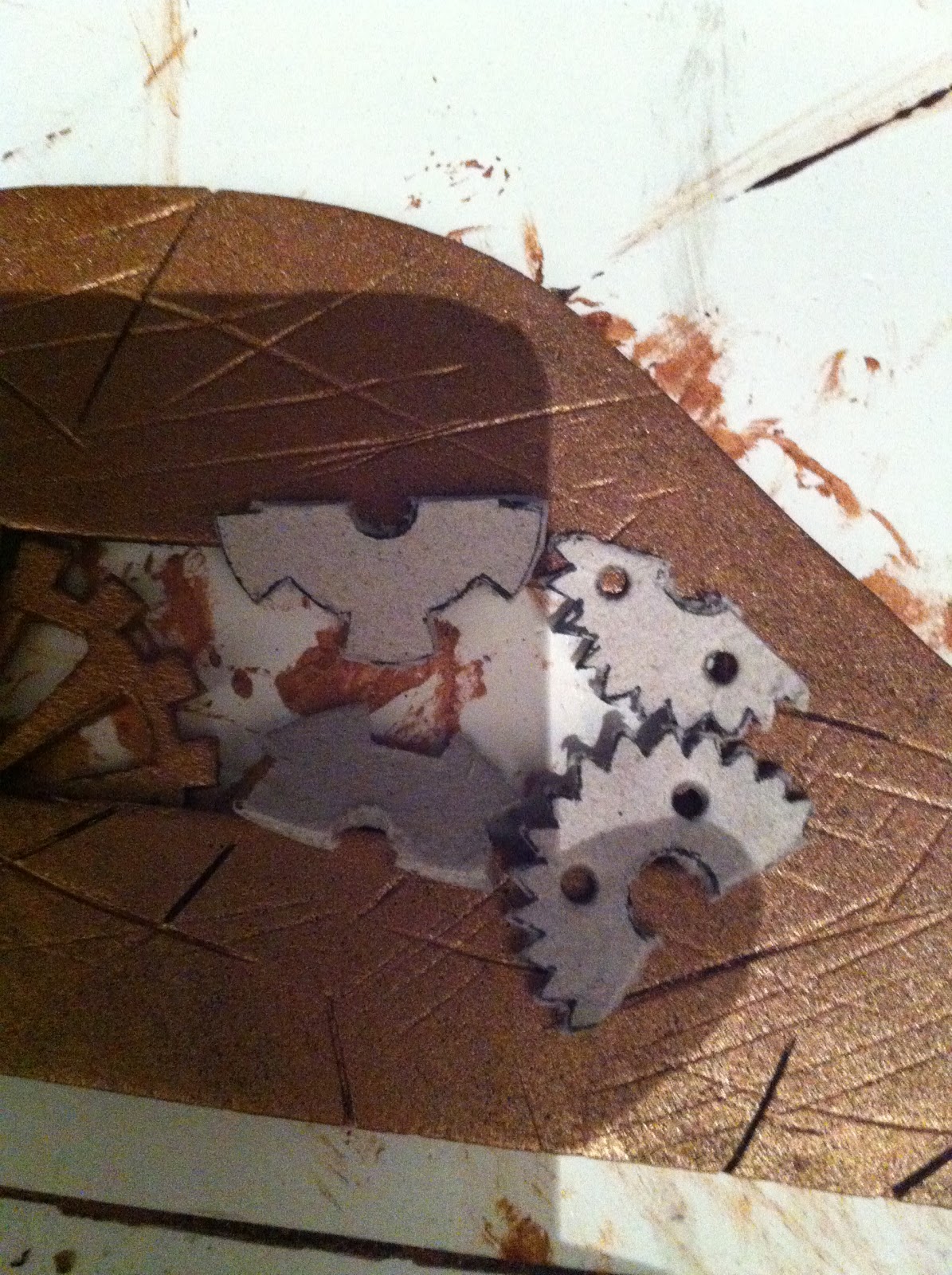 Seeing as how it's a Steampunk LARP the costume piece had to have cogwheels in it somewhere. I wanted to look like the cogs did something and where not there just for show. So they were added in two area. One on the top of the gauntlet, showing the clockwork that made the fingers work. The second was just before the wrist on the forearm section. The cogs where cut from card and then coloured in a brass/copper paint. You can also see the extent I went to with the weathering on the metal of the gauntlet. This is also why I had two layers of foam on the arm. It added a nice sense of depth when looking at the clockwork giving the feeling that it's not just cogs on top of the arm, they are inside it.